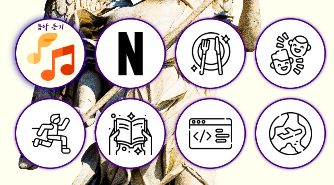 let animals = ['음악 듣기', '드라마 보기', '맛집 탐방', '친구 만나기', '러닝', '독서', '코딩', '여행'];